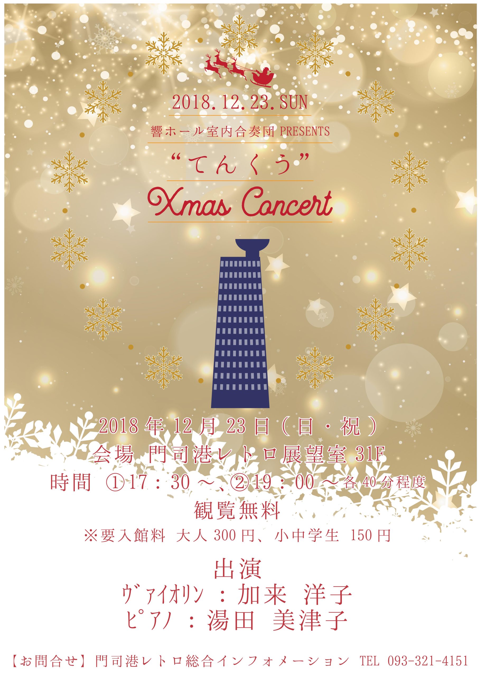 Home クリスマスコンサート @門司港レトロ展望室 クリスマスコンサート @門司港レトロ展望室 2018.10.16 Post Share カレンダー カレンダーに追加 Timely カレンダーに追加 Google に追加 Outlook に追加 Apple カレンダーに追加 他のカレンダーに追加 XML ファイルとしてエクスポート 日時: 2018年12月23日 @ 5:30 PM 2018-12-23T17:30:00+09:00 2018-12-23T17:45:00+09:00 場所: 門司港レトロ展望室 北九州市門司区東港町1-32 お問い合わせ: イベントのサイト 依頼演奏 門司港レトロ展望室 響ホール室内合奏団PRESENTS “てんくう”Xmas Concert 日時:2018年12月23日(日)①17:30~ ②19:00~ 各40分程度 場所:門司港レトロ展望室 出演者: ヴァイオリン 加来洋子 ピアノ 湯田美津子 料金: 無料 ※門司港レトロ展望室入場料が必要(大人300円 小中学生150円)