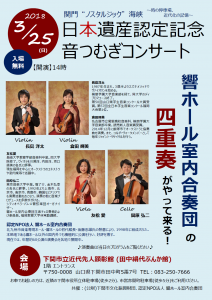 Home音つむぎコンサート2017⑩ @田中絹代ぶんか館音つむぎコンサート2017⑩ @田中絹代ぶんか館 2017.11.10 Post Share カレンダー カレンダーに追加 Timely カレンダーに追加 Google に追加 Outlook に追加 Apple カレンダーに追加 他のカレンダーに追加 XML ファイルとしてエクスポート 日時: 2018年3月25日 @ 2:00 PM2018-03-25T14:00:00+09:002018-03-25T14:15:00+09:00場所: 下関市立近代先人顕彰館 田中絹代ぶんか館 音つむぎコンサート音つむぎコンサート2017⑩ 日時:2018年3月25日(日) 14:00〜場所:下関市立近代先人顕彰館 田中絹代ぶんか館出演者: ヴァイオリン 長島洋太 倉田輝美 ヴィオラ 友松愛 チェロ 関原弘二